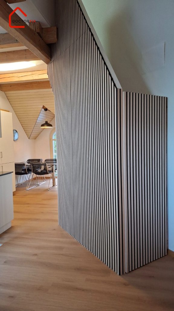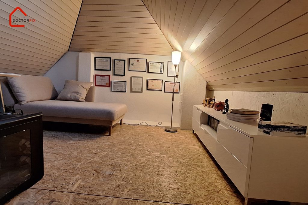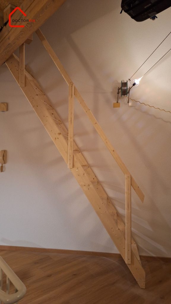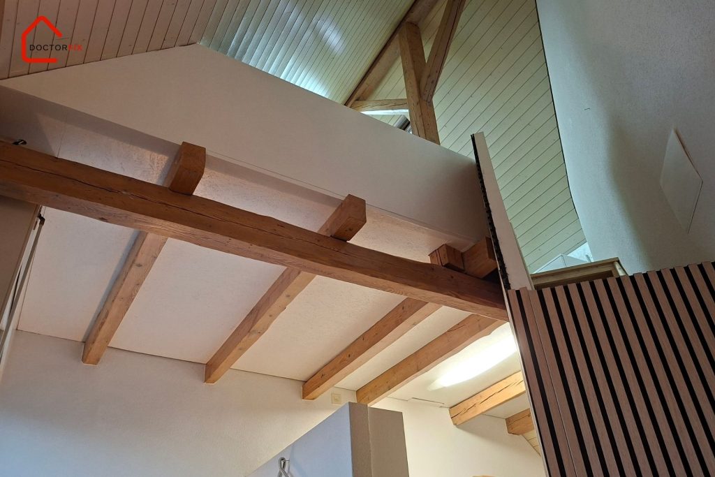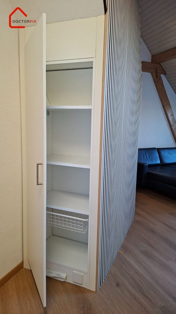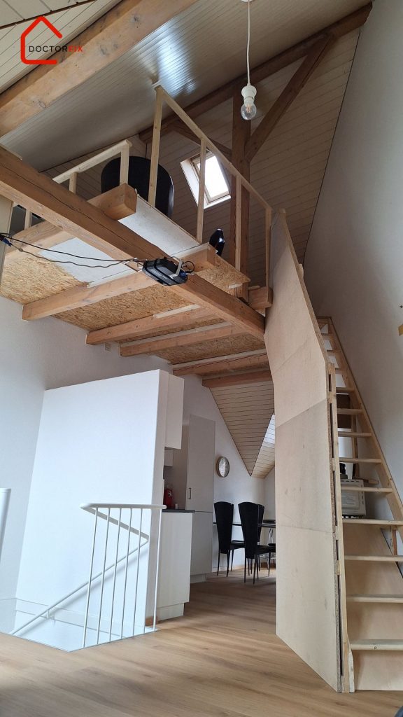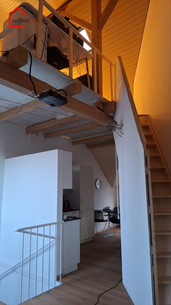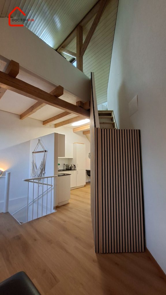 O acesso faz-se através de uma escada de madeira revestida e protegida, que se integra de forma harmoniosa no ambiente. Aproveitando o vão da escada, foi concebido um armário voltado para a cozinha, garantindo arrumação extra sem comprometer a estética.