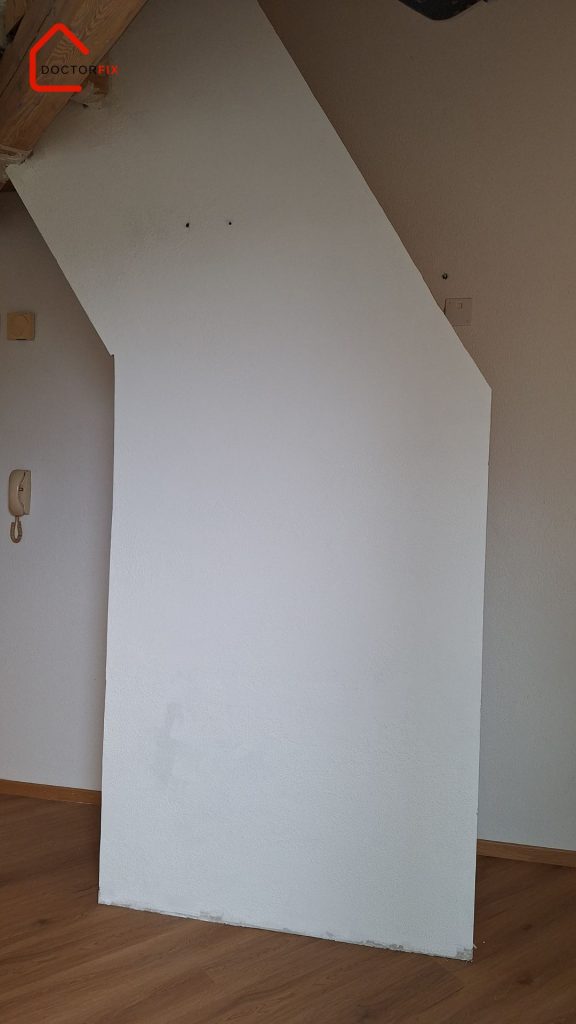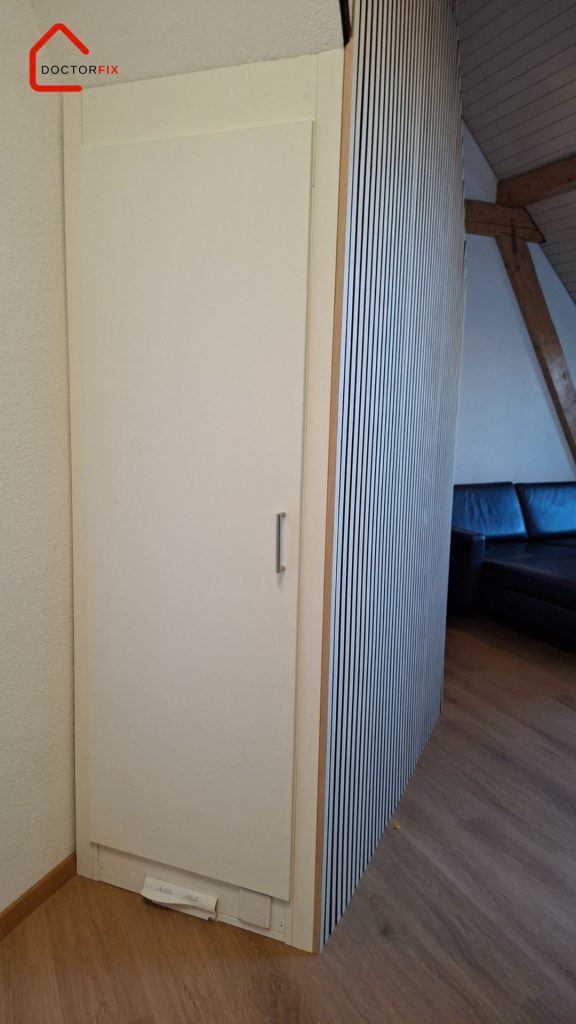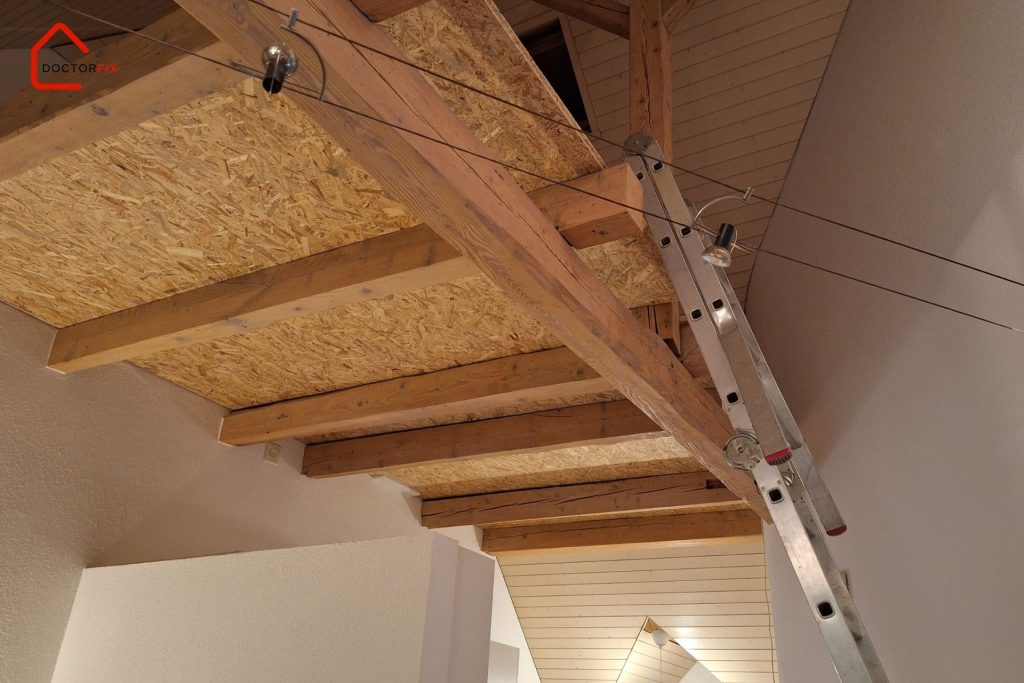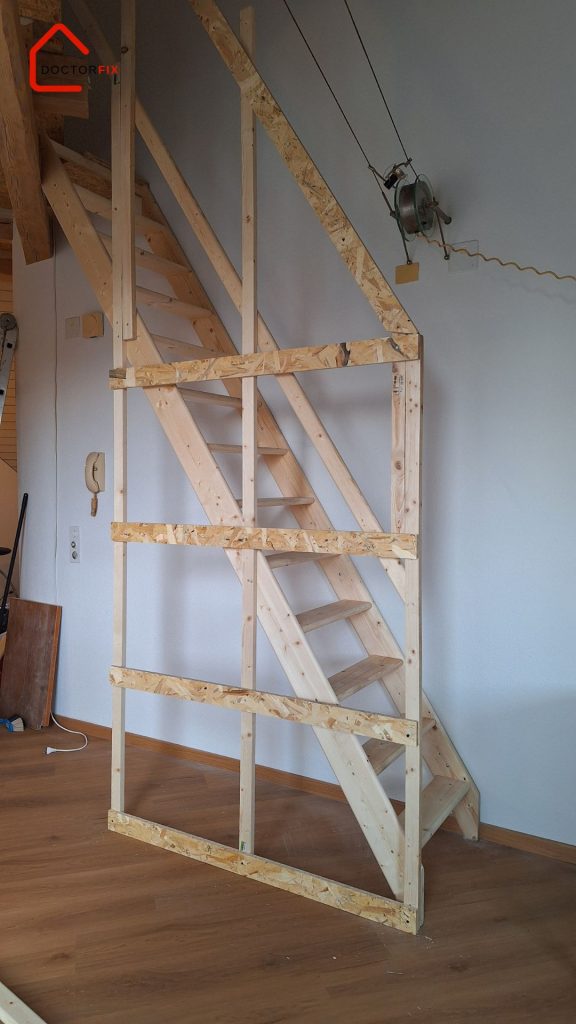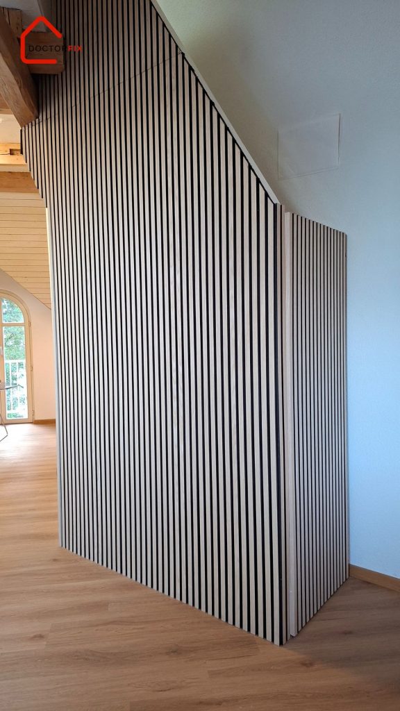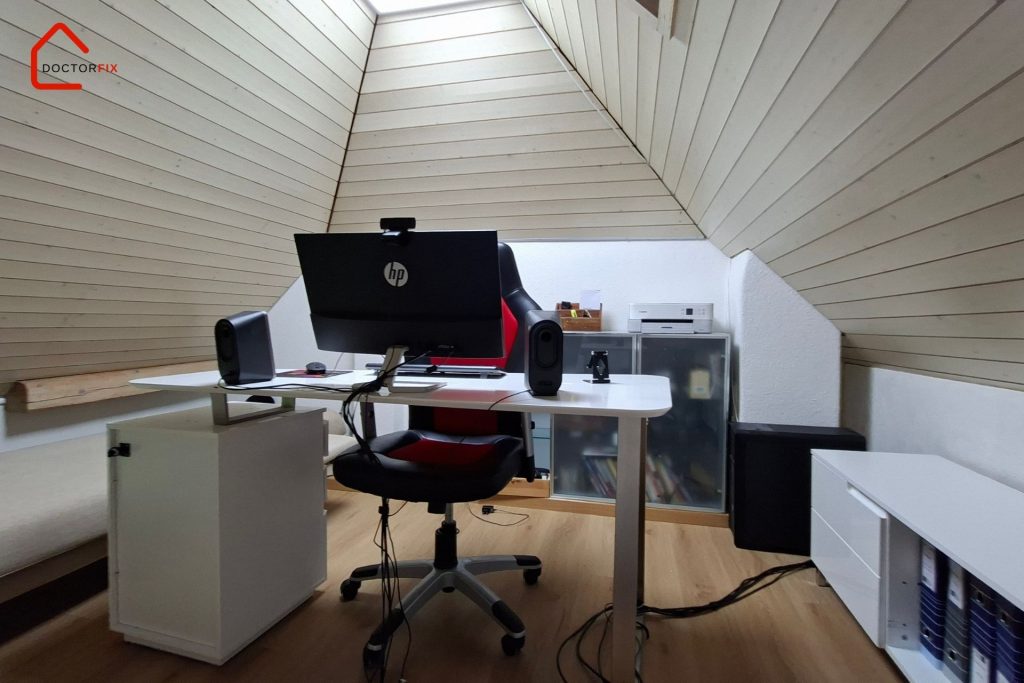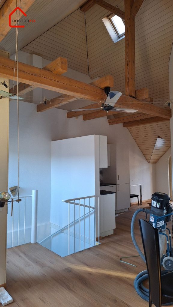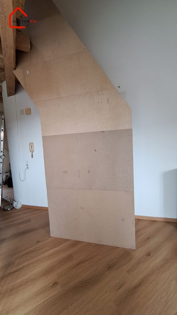 O acesso faz-se através de uma escada de madeira revestida e protegida, que se integra de forma harmoniosa no ambiente. Aproveitando o vão da escada, foi concebido um armário voltado para a cozinha, garantindo arrumação extra sem comprometer a estética.
